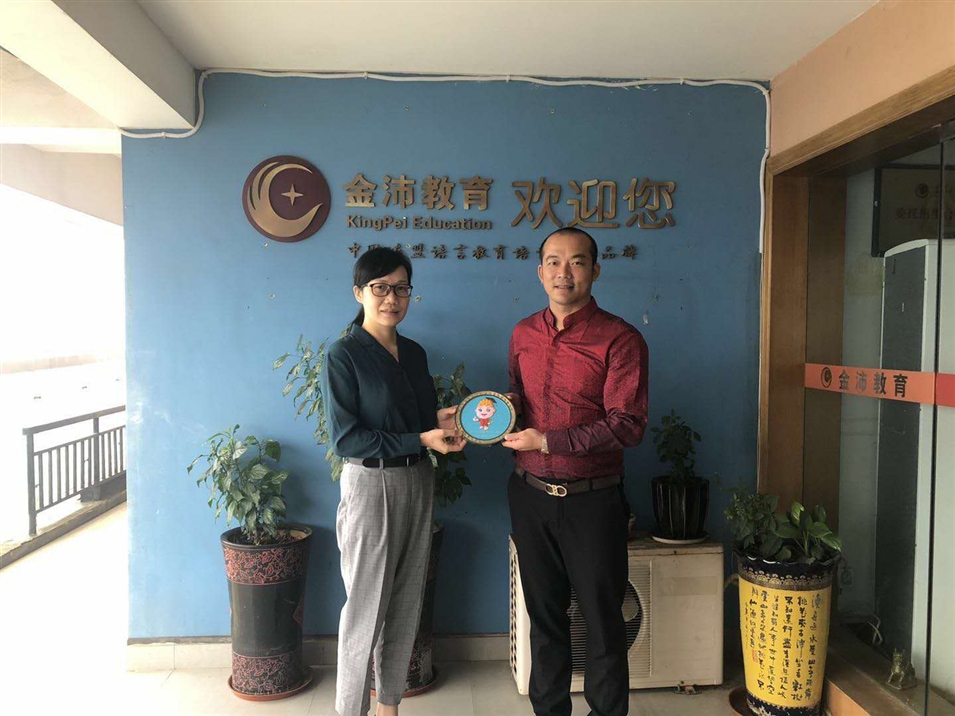 廣西金沛教育執(zhí)行董事粟宥朝右一向廣西國(guó)際文化交流中心羅副秘書長(zhǎng)(左一)贈(zèng)送吉祥物“金小沛”