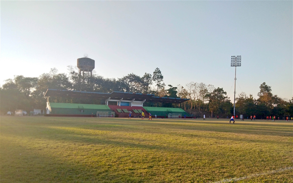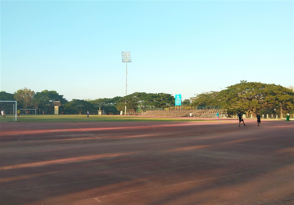老撾國(guó)立大學(xué)的同學(xué)就很喜歡踢足球,足球場(chǎng)在學(xué)校的東面,球場(chǎng)正面是主席臺(tái),側(cè)面還設(shè)有一處看臺(tái),大約可以容納270名觀眾。跑道一圈也是400米,占地面積很大。球場(chǎng)中間的草是真草,有專門(mén)的人員養(yǎng)護(hù)。
