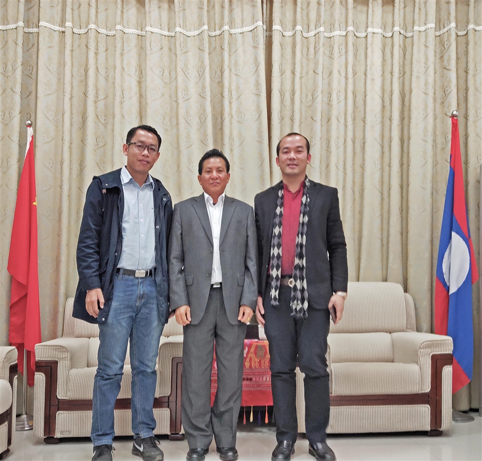 老撾駐南寧總領事館副領事坎平(中間)與老撾蘇州大學校長助理馮溫格(左一)、廣西金沛教育執(zhí)行董事粟宥朝(右一)合影留念