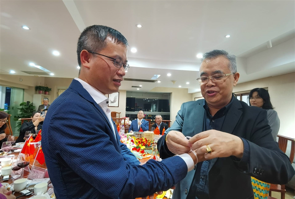 (老撾駐南寧總領(lǐng)事館總領(lǐng)事維拉薩宋蓬先生為致公黨廣西區(qū)委秘書(shū)長(zhǎng)兼辦公室主任李永政先生栓線禮節(jié))