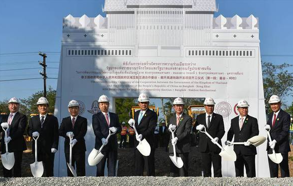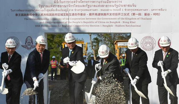 12月21日,泰國(guó)總理巴育(左三)與中泰鐵路合作聯(lián)委會(huì)中方主席、國(guó)家發(fā)改委副主任王曉濤(左二)等嘉賓們?cè)谔﹪?guó)東北部呵叻府巴沖縣舉行的中泰鐵路合作項(xiàng)目一期工程開(kāi)工儀式上共同鏟土。當(dāng)日,中泰鐵路合作項(xiàng)目一期工程開(kāi)工儀式在呵叻府巴沖縣舉行。李克強(qiáng)總理向開(kāi)工儀式發(fā)來(lái)賀信。泰國(guó)總理巴育親臨現(xiàn)場(chǎng)致辭。中泰鐵路合作聯(lián)委會(huì)中方主席、國(guó)家發(fā)改委副主任王曉濤、中國(guó)駐泰國(guó)大使呂健,泰國(guó)交通部長(zhǎng)阿空、內(nèi)政部長(zhǎng)阿努蓬,以及來(lái)自中泰政府部門(mén)、鐵路管理部門(mén)、相關(guān)企業(yè)、媒體等近400人出席開(kāi)工儀式。新華社記者李芒茫攝
