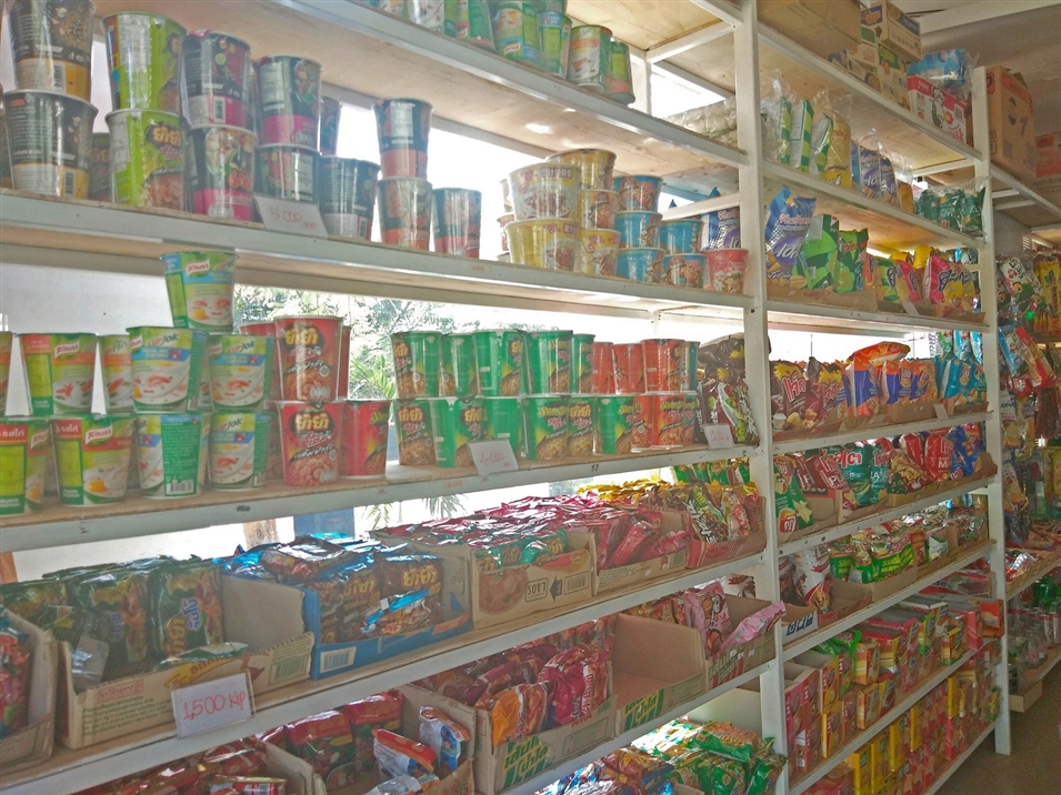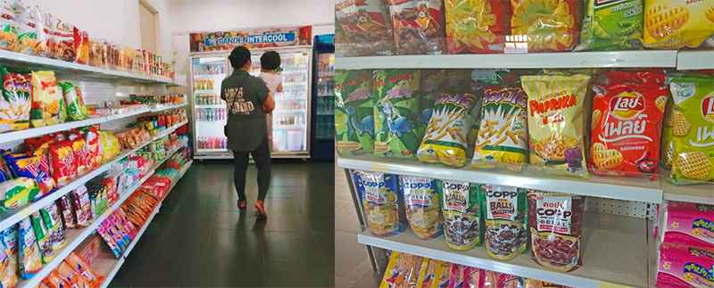 食堂區(qū)的小商店我們在《我在老撾國立大學(xué)的生活—食堂篇》中介紹過,其實(shí)可以猜到,既然開在食堂,那售賣的物品當(dāng)然以食物為主,比如紅牛、牛奶、果汁、汽水之類的飲料應(yīng)有盡有,當(dāng)然,薯片、餅干也是必不可少的。