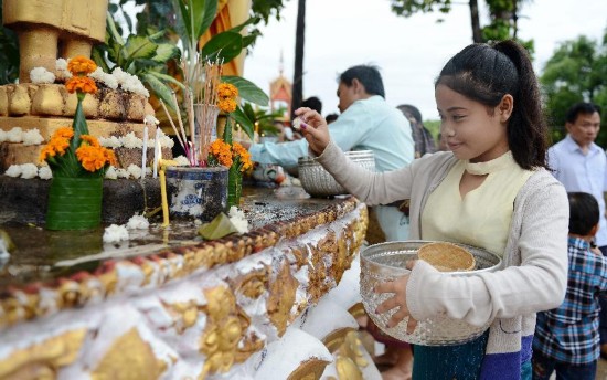 老撾人在寺院拜佛、浴佛、潑水、栓線、布施、堆沙、放生等,同時在家里、大街上相互潑水、祝福,讓純潔的水洗刷掉過去的疾病、災(zāi)禍和祈求來年雨水充沛,五谷豐登,迎接美好的新的一年。