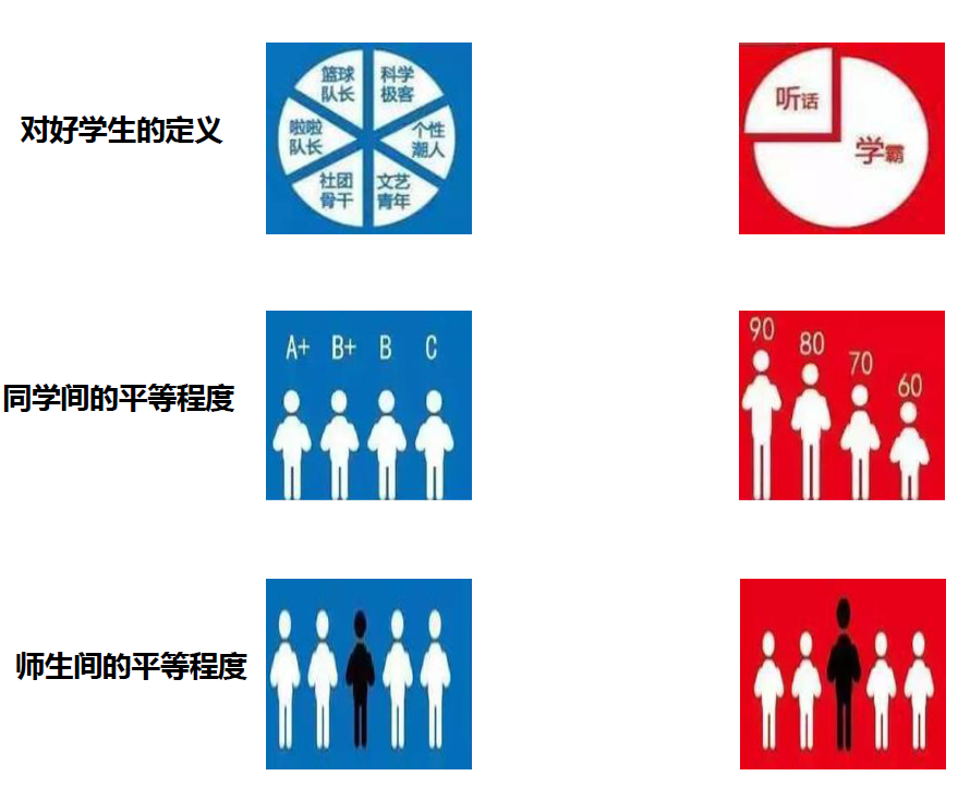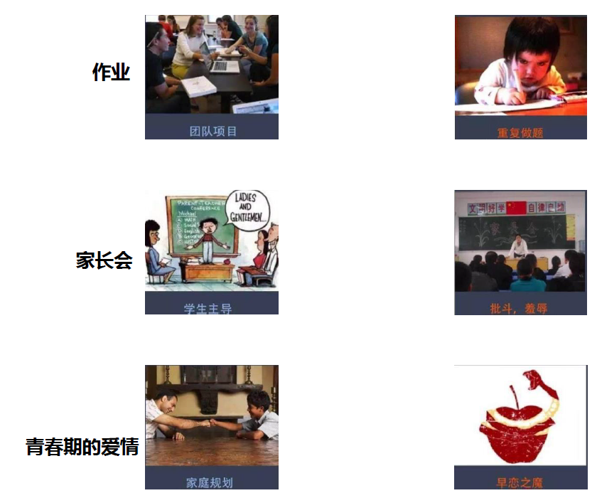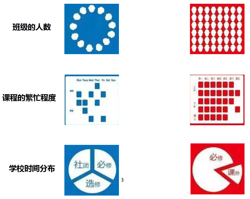 “嘗試教育”,學生為主;學生大多圍成圈,老師講究與學生的課堂互動