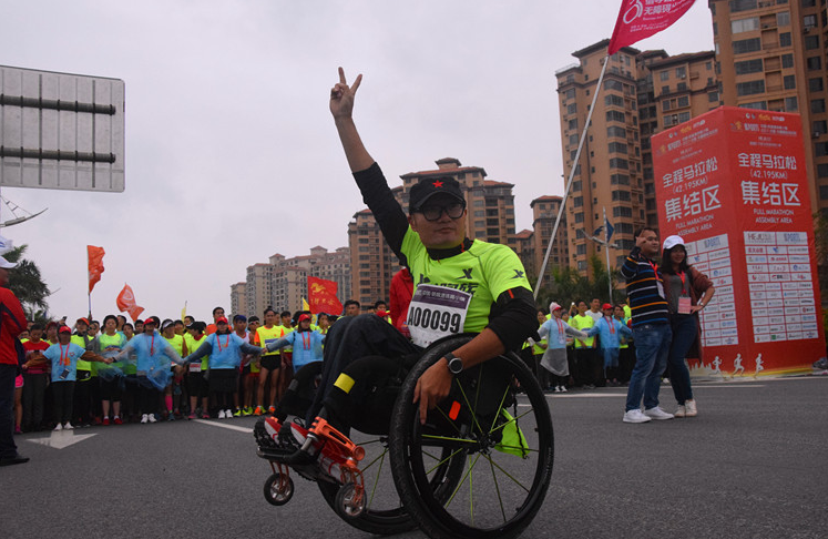 在眾多的選手中,坐在輪椅上的張先生顯得尤為搶眼。張先生來自廣州,他告訴記者,這是他參加的第54場馬拉松比賽,也是第一次參加全海景跑道的馬拉松, “我參加比賽不是為了出成績或出風(fēng)頭,而是重在參與,是想體現(xiàn)一種精神?!睆埾壬f,他不一定能全部“跑”完全程,但他一定會(huì)堅(jiān)持到最后。