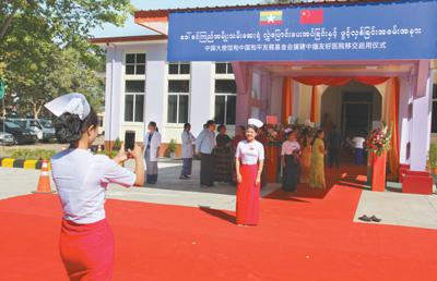 在中緬友好醫(yī)院暨杜慶芝醫(yī)院移交啟用儀式上,醫(yī)院護(hù)士在醫(yī)院門(mén)口拍照留念。