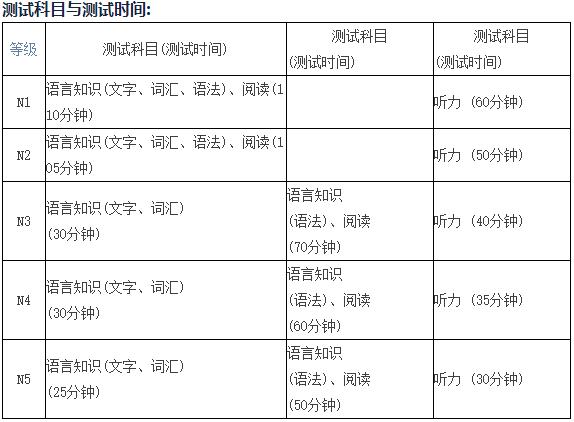 N3、N4、N5考試分"語(yǔ)言知識(shí)(文字、詞匯)";"語(yǔ)言知識(shí)(語(yǔ)法)、閱讀"及"聽力"3個(gè)科目,滿分均為180分。